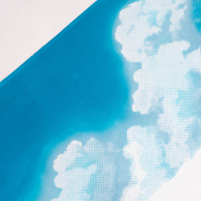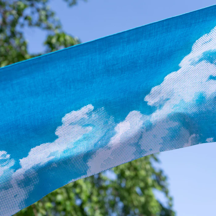 点描のような表現で迫力のある入道雲を描いた夏にぴったりなてぬぐいです。広げたときのリアルな情景にきっと驚くはず。近年人気の、フィギュアやミニチュア小物の撮影の背景にお使いいただいても楽しい一枚です。