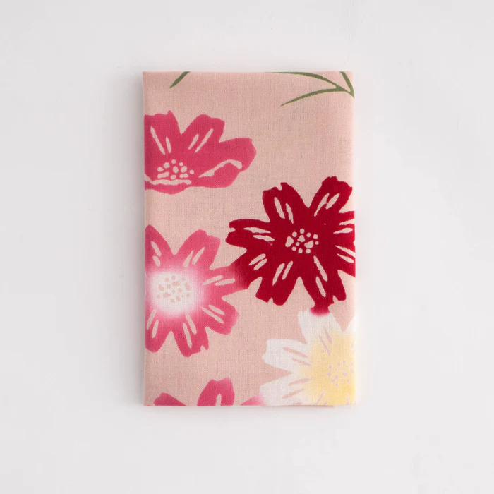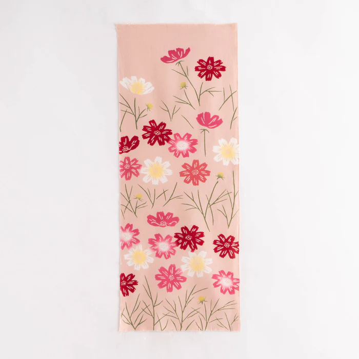 一面に咲き乱れるコスモス畑の風景を切り取ったようなてぬぐいです。秋空に向かってのびのびと咲くコスモスを描いています。