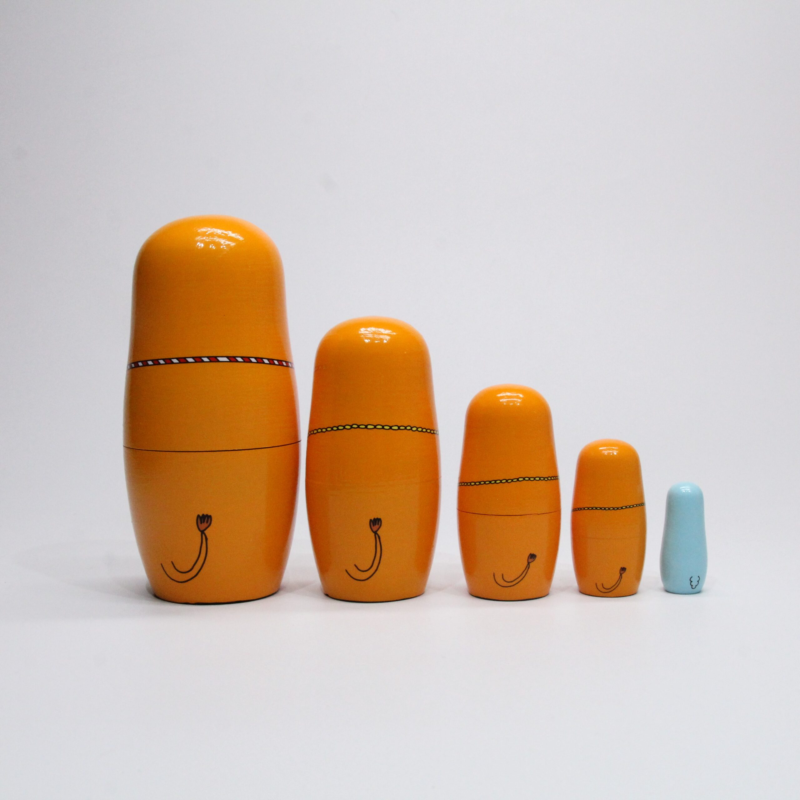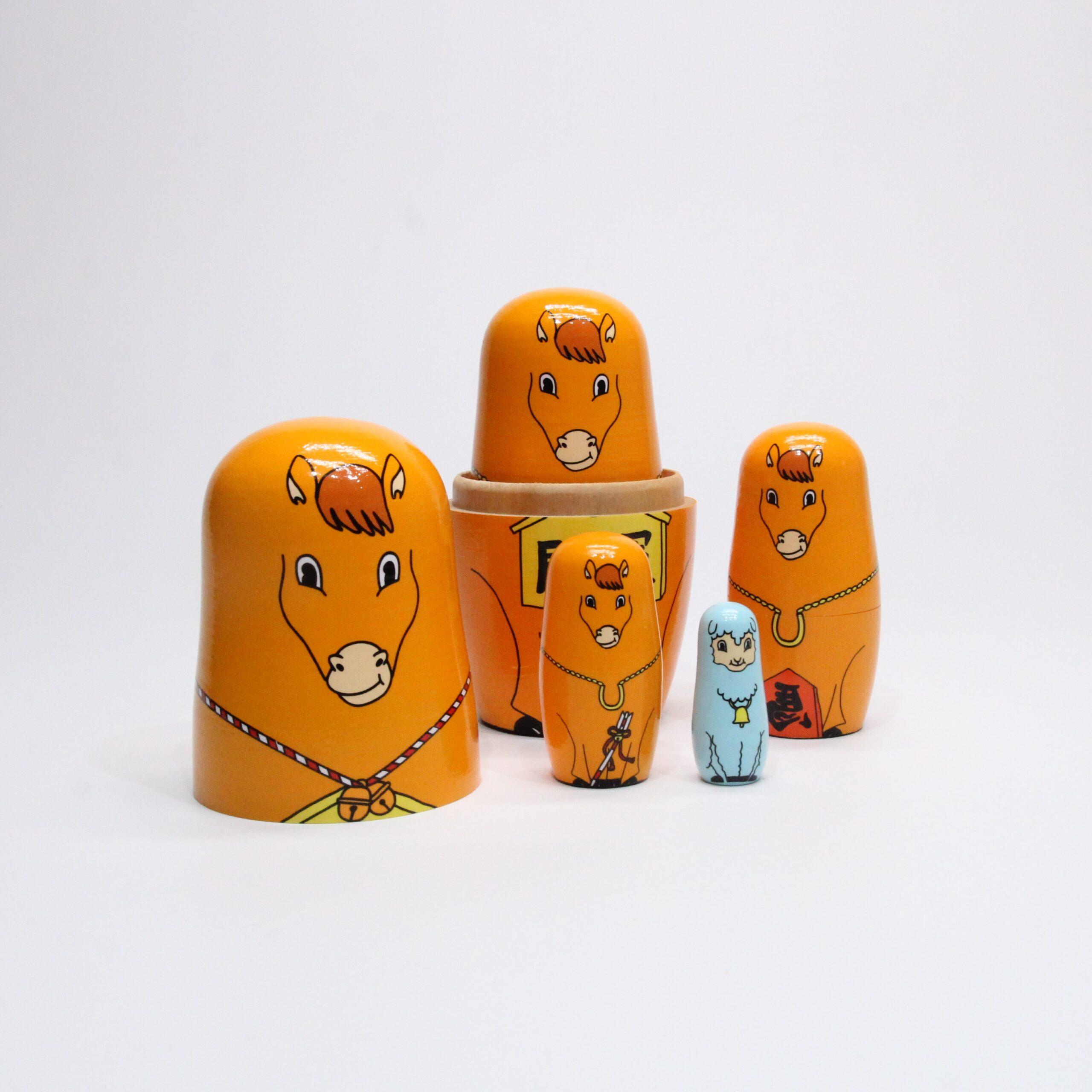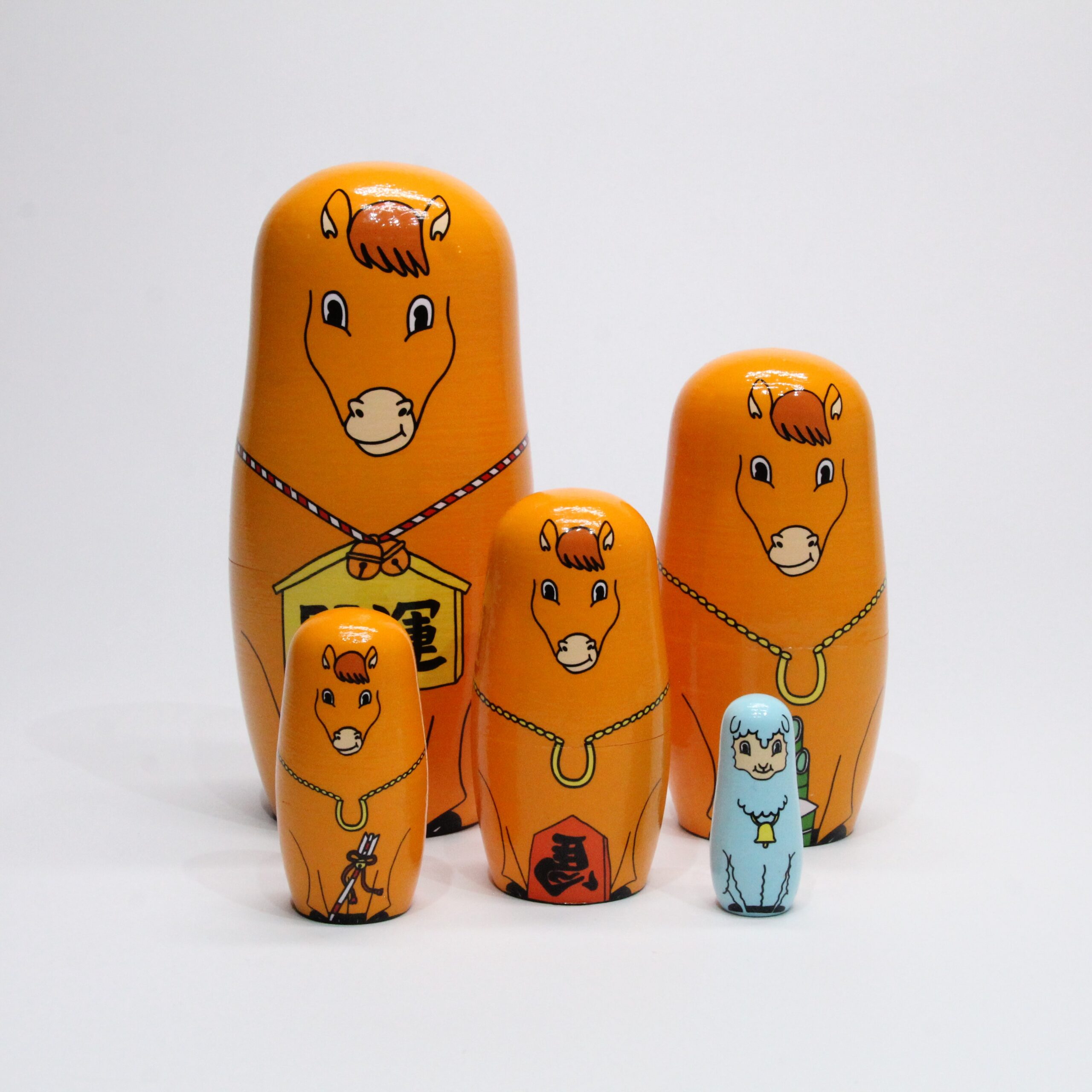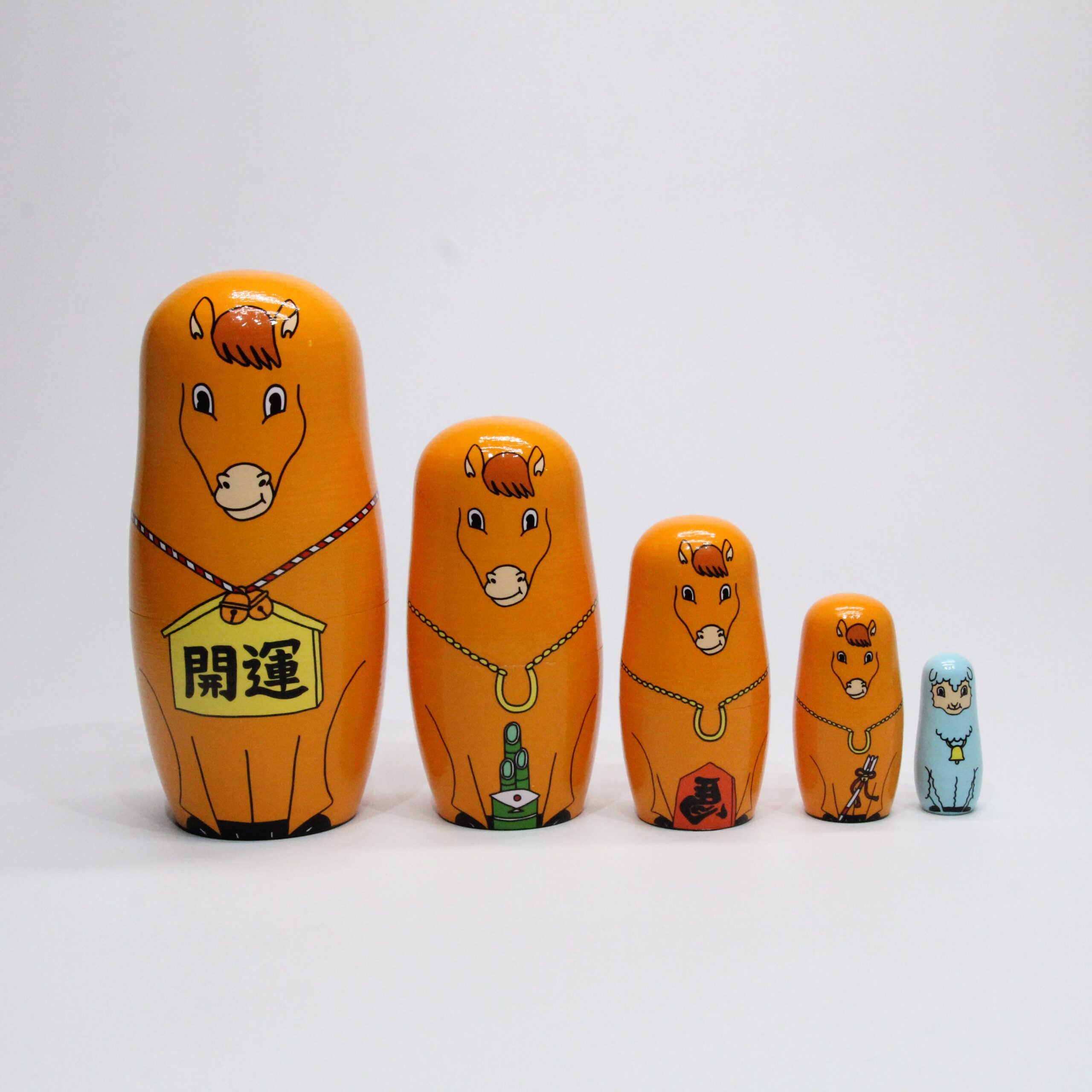 3番目は左馬(ひだりうま)、4番目は破魔矢を持っています。首からはヨーロッパで縁起のよいホースシュー(馬蹄)を下げており、盛りだくさんの縁起物は見ているだけでいいことが起きそう。最後の5番目には27年の干支の未(羊)がひょっこり待機しています。