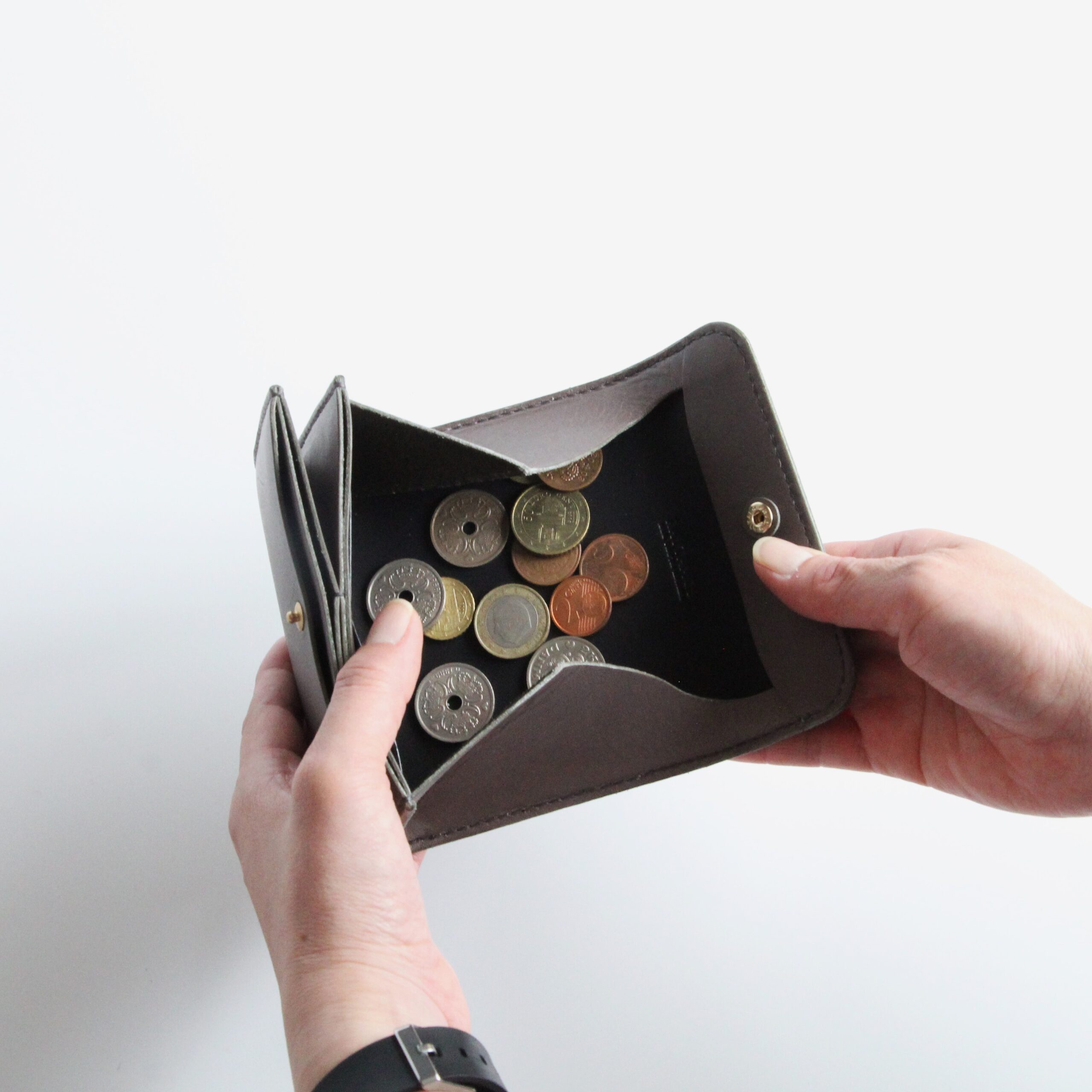 吊り込みという技法を用い、蓋を自然と内側にカールさせることで小銭が滑り落ちないように工夫されており、コインポケットの内部に黒いインナーを採用することで大きく開げた際にも上品な印象です。